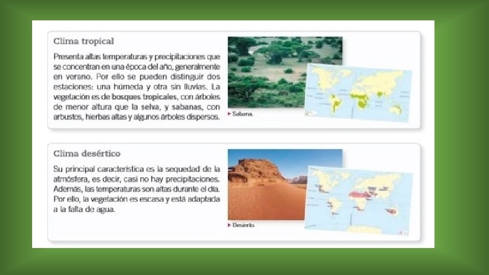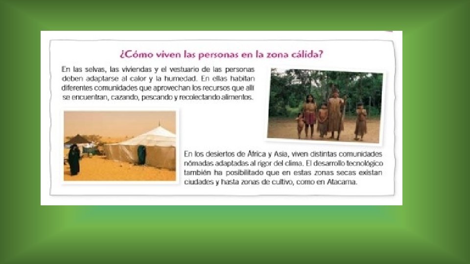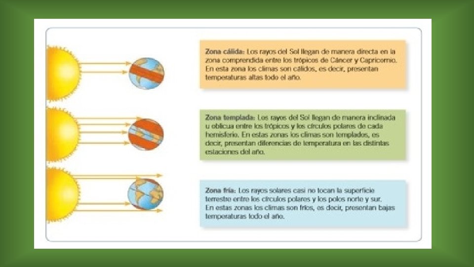 La Zona cálida • La zona cálida En la zona cálida, los rayos solares llegan a la superficie terrestre de manera directa durante todo el año. Por ello, los climas presentan altas temperaturas y, en algunos casos, abundantes precipitaciones.