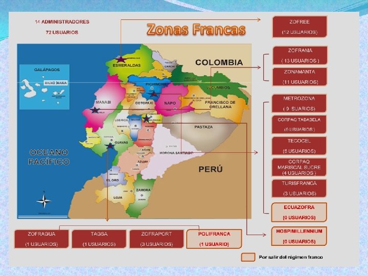 Ventajas de invertir en zona franca q Exoneración de impuestos, derechos y gravámenes arancelarios para las importaciones y exportaciones. q Exoneración de los impuestos a la renta de nacionales y extranjeros, impuestos municipales y provinciales, sobre producción, uso de patentes, marcas, transferencia tecnológica, remesas de utilidades al exterior. q Libertad total para utilizar beneficios y cupos para las exportaciones ecuatorianas según acuerdos internacionales. q Contratación laboral más flexible. q Sistema Interconectado de Control de Inventarios, que permite al inversionista llevar el control de sus operaciones. q Las mercancías nacionales y extranjeras pueden permanecer por períodos ilimitados. q Ubicación geográfica del Ecuador. q Marco Legal adecuado y relanzamiento del Régimen Franco.