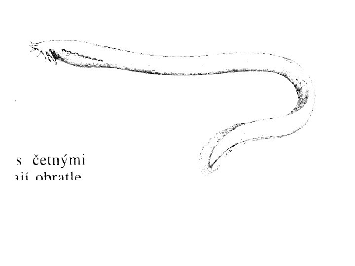Třída sliznatky (Myxini) Hlavní znaky : 1. Obyvatelé moře s řadou primitivních znaků. Válcovité protáhlé tělo, lysá pokožka bez šupin vybavená velikým množstvím slizových žláz. Velká produkce slizu slouží k obraně před predátory, sliz obaluje i potravu v trávicím traktu (sliznatky nemají imunitní systém). 2. Nemají končetiny ani obratle, vnitřní kostra : blanitá lebka a žaberní koš. 3. Hřbetní ploutev není. 4. Nepárový nosní otvor spojen s hypofýzou a hltanem. 5. Vývoj přímý (není larva), vajíčka bohatá žloutkem, rýhování meroblastické. 6. Ústní otvor adaptován na zahryzávání do kořisti, požírají bezobratlé a uhynulé ryby. Hltan, jícen, střevo bez spirální řasy. 7. Zakrnělé oči překryté kůží – život v sedimentech mořského dna.