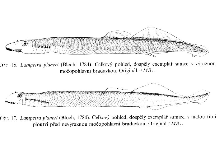 Třída mihule (Cephalaspidomorpha) Hlavní znaky : 1. 2. 3. 4. 5. 6. 7. 8. 9. „Kruhoústí“ bezčelistnatci. Obyvatelé sladkých vod i moře. Válcovité protáhlé tělo, lysá pokožka bez šupin, zřetelně lze vidět 7 párů žaberních štěrbin. Chorda je plně vyvinutá, vytvořeny chrupavčité základy horních oblouků obratlů, těla obratle nejsou. Nemají končetiny, lebka je Hřbetní ploutev vyvinutá. Nepárový nosní otvor spojen pouze s hltanem (nikoliv s hypofýzou). Vývoj nepřímý (larva = minoha), vajíčka bohatá žloutkem, rýhování holoblastické. Ústní otvor adaptován na přisávání ke kořisti (parazitické druhy : jazyk jako píst; neparazitické druhy : dospělci mají zakrnělou trávicí trubici. Oči vyvinuté + nepárové podkožní oči na temeni hlavy. Jednoduchá postranní čára (neuromasty). Anadromní migrace. V ČR původně 4 druhy, dnes jen 2.