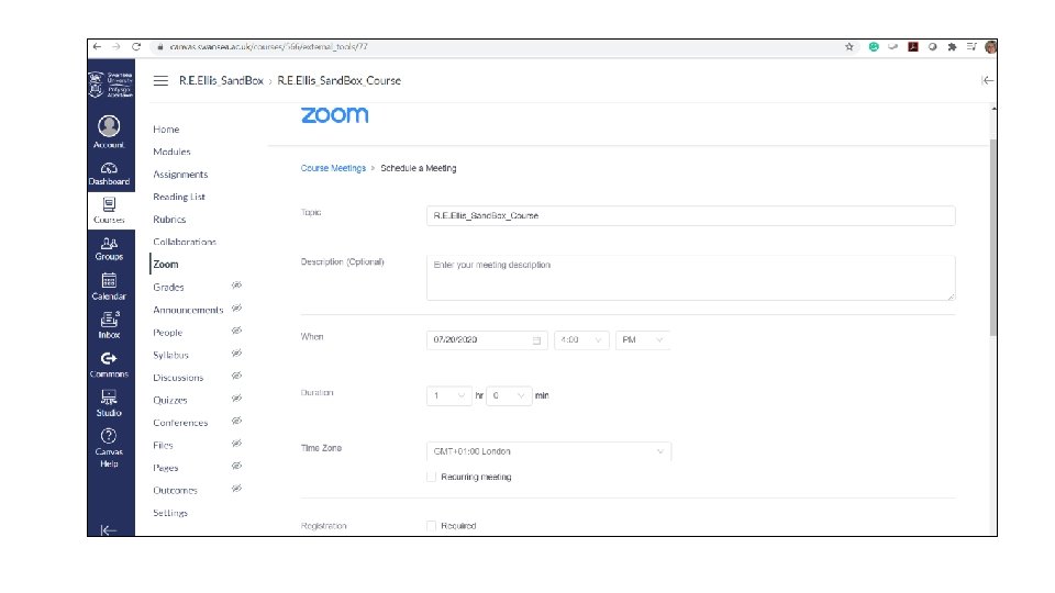 Using the scheduling form in Canvas Ways to share the joining info The link will be embedded in the course and the calendar - best for large numbers of students (if you have one). (some screenshots and signposting to staff guidance to come)