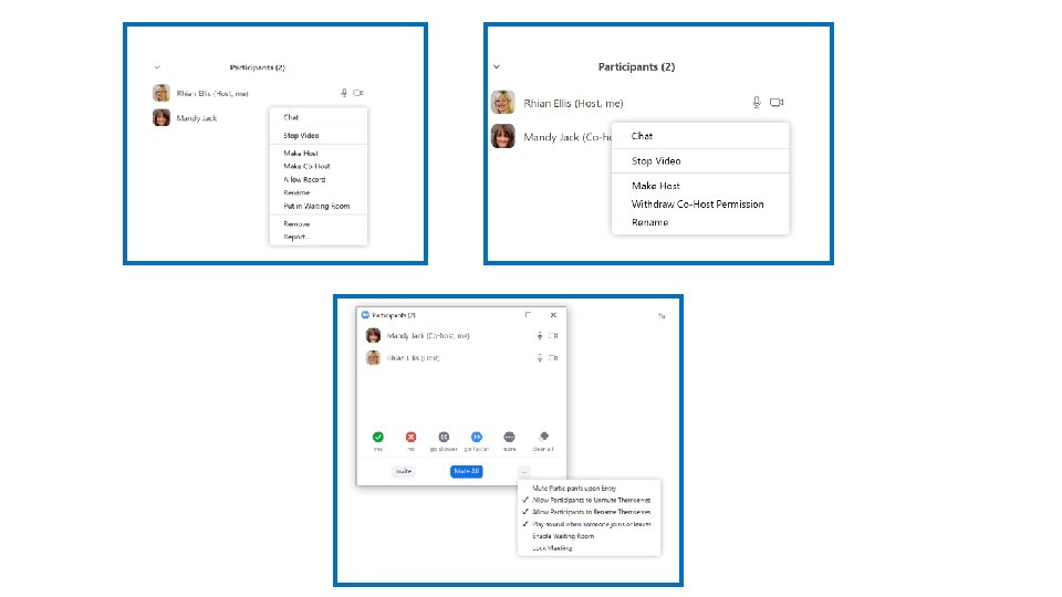 Role Privileges 4. Participants … Defaulted to ‘basic’ privileges, such as mic and video sharing, but can be managed in ‘Settings’ when scheduling or editing the meeting, and even within the session (more to come on this) e. g. No Screen share by default (security)