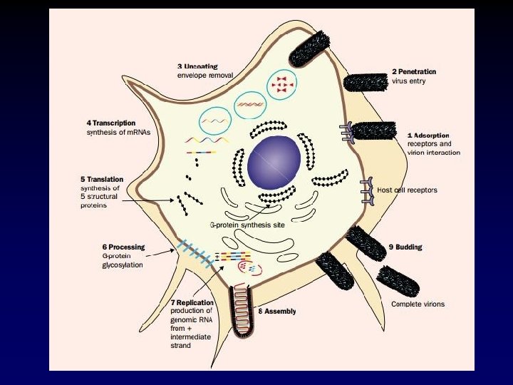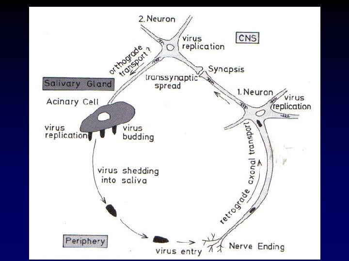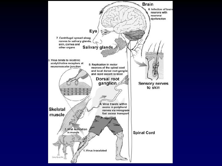 Patogenia n n n Após inoculação, o vírus se multiplica no músculo estriado ou tecido conjuntivo no sítio de inoculação e penetra nos nervos periféricos através da junção neuro -muscular. Segue ao CNS via movimento axonal retrógrado. Terminalmente, o vírus se dissemina de forma centrífuga para os órgãos do corpo. O vírus causa pouca destruição neuronal.