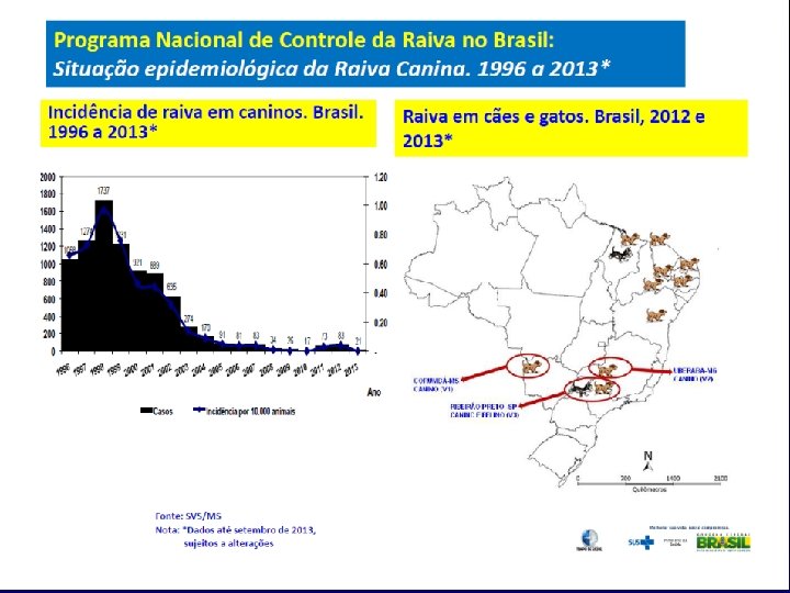 Tratamento e prevenção n n n Profilaxia pré-exposição - vacinas inativadas Profilaxia pós-exposiçãos - observação de animais suspeitos por 10 dias. Se surgirem sinais, devem ser sacrificados e remetidos ao laboratório para diagnóstico. Animais selvagens: devem ser sacrificados e examinados. A profilaxia pós-exposição baseia-se na desinfecção local, na administração de vacina ou, em casos graves, soro + vacina. Uma vez estabelecida a doença => tratamento de suporte.