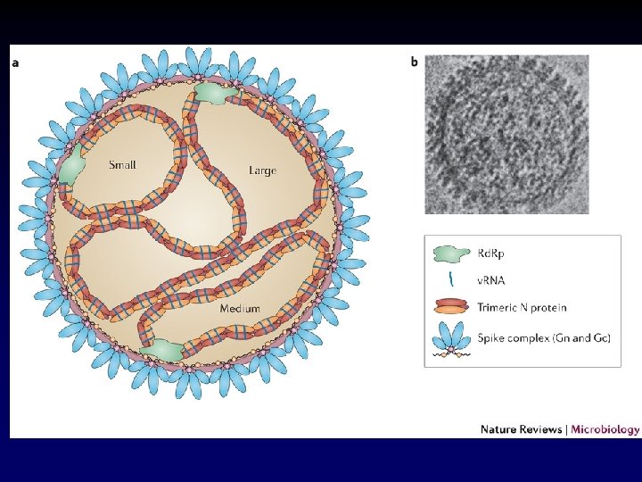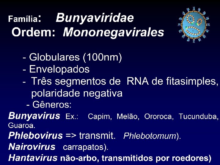 Os Hantavírus n n Formam um gênero distinto dentro da família Bunyaviridae. Diferente dos demais bunyavírus, não é transmitido por artrópodos. Vírus de fita simples, envelopado, com três fitas de RNA (L, M, and S). Vírions 98 nm em diâmetro.