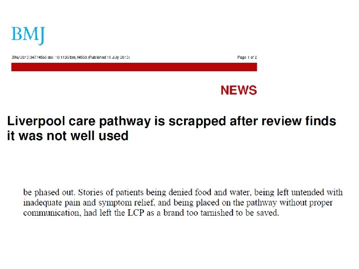 LCP in UK: kritieken • Slechte zorg aan eind van het leven – Meer lijden door slaafs volgen van procedure… – Teveel pijnstillers zelfs in afwezigheid van pijn… – Veel te vroeg starten … • Indruk dat het de dood bespoedigt • ‘pad naar de dood’ • Geen bewezen effect