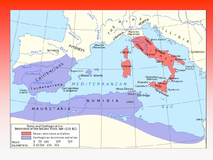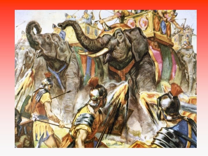 • 2. punská válka 218 – 202 př. n. l. Hannibal (geniální vojevůdce) nenávist k Římu zimní přechod přes Alpy se slony –překvapení !!! Polovina vojska zahynula, sloni uhynuli.