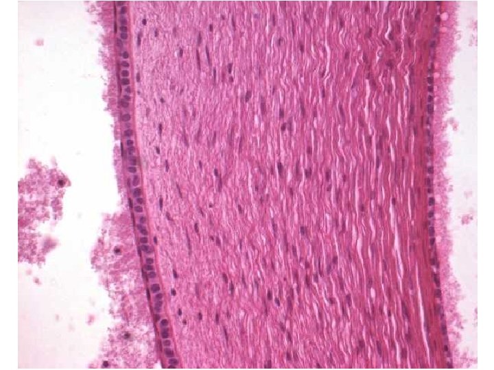 Rohovka – vrstvy Epithelium anterius corneae • vícevrstevný dlaždicový nerohovějící epitel – obvykle 5 vrstev, 70 µm • velká regenerační schopnost (6 -denní cyklus), na okrajích dendritické Langerhansovy buňky • volná nervová zakončení v předním epitelu – z větví n. V 1 • povrchová vrstva (stratum superficiale) – oploštělé buňky mají na apikální povrchu mikroklky • prostřední vrstva (stratum intermedium) – obsahuje buňky překrývajíc vždy dvě bazální buňky pod ní • bazální vrstva (stratum basale) – kubické buňky, jejich lamina basalis spojená hemidezmozómy s hlubší lamina limitans anterior