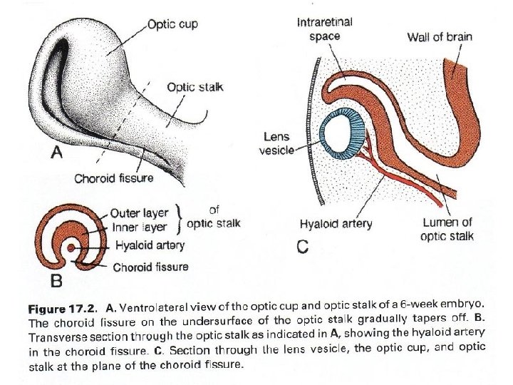 OPTIC CUP DEVELOPMENT II: Choroid fissure Mesenchyme Blood vessels have to be introduced early into the soon to be enclosed round eye Together with the invagination centrally at the end of the optic cup, an invagination along the cup & stalk’s inferior surface occurs, to create the choroid fissure in which runs the hyaloid artery