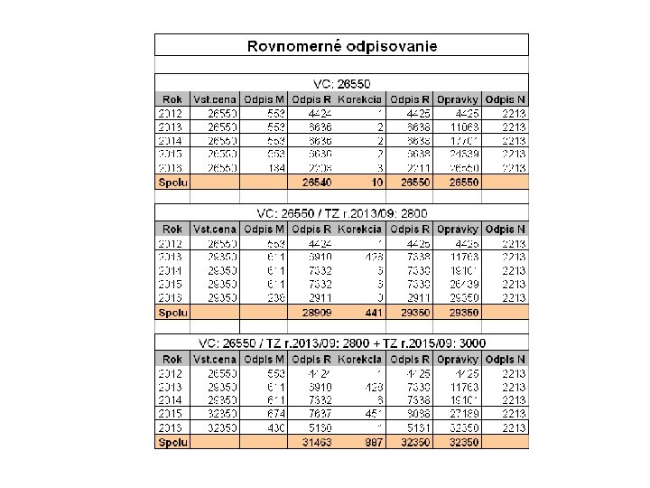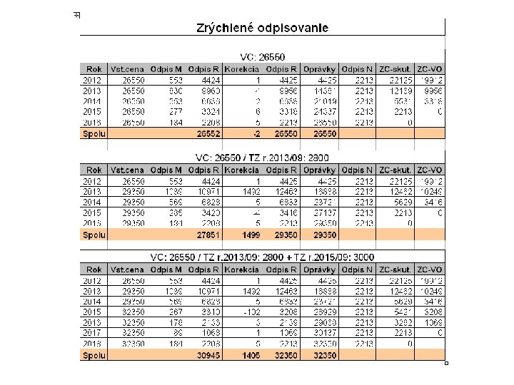 ZRÝCHLENÉ ODPISOVANIE – TECHNICKÉ ZHODNOTENIE 2 RAZY • • VC: 26550 Dátum nadobudnutia 5/2012 TZ rok 2013: 2800 + TZ rok 2015: 3000 Neuplatnený odpis v prvom roku: 6638 -4425=2213