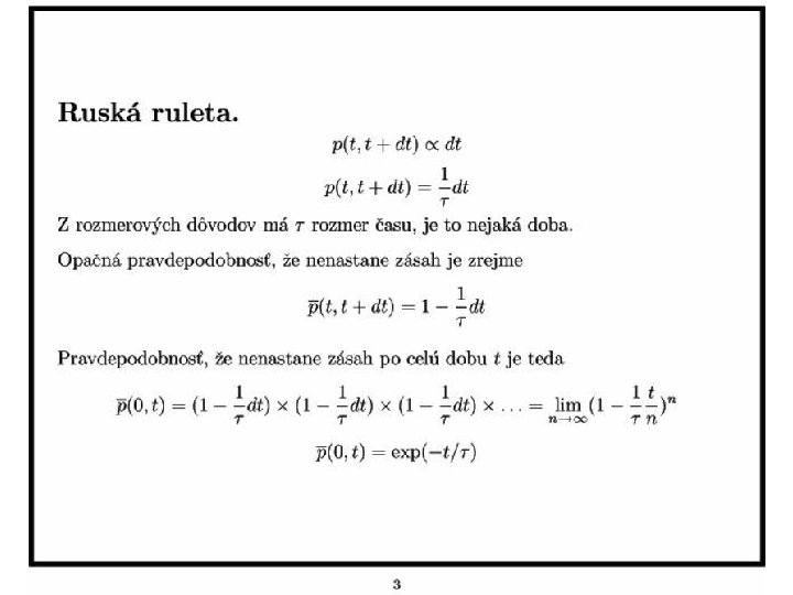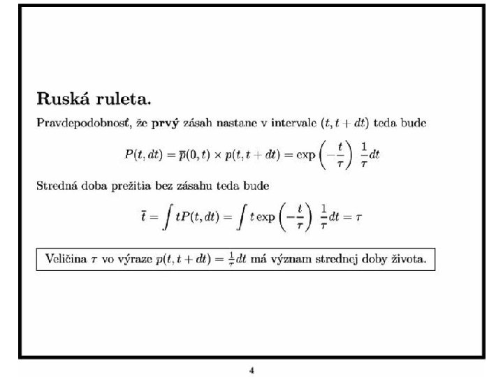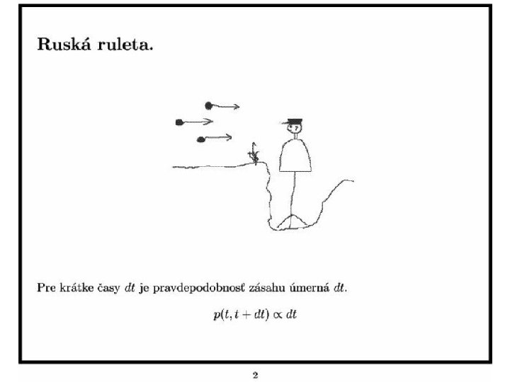 Zrážky častíc Rovnovážny stav plynu nastáva v dôsledku zrážok častíc. I v prakticky ideálnom plyne, keď typicky sa molekuly nachádzajú ďaleko od seba a pri počítaní energie plynu nemusíme zarátavať potenciálnu energiu vzájomnej interakcie molekúl, dochádza pri náhodnom blízkom priblížení molekúl k zrážkam. Uvedieme si teraz niekoľko technických vecí, ktoré sa používajú pri teoretickom popise zrážkových procesov. Postupne si priblížime pojmy • stredná doba medzi zrážkami • stredná voľná dráha • účinný prierez zrážky