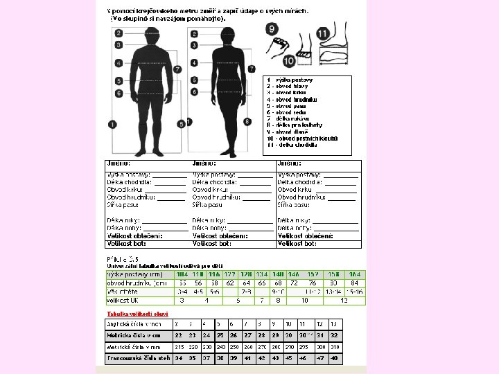 Závěr - Všichni sedí opět na koberci s pracovními listy. Učitel klade otázky: – Kdo si myslíte, že. . je nejvyšší, nejmenší, má nejdelší – nejkratší chodidlo, nejširší – nejtenčí pas…. Žáci odpovídají, hned dochází ke kontrole pomocí pracovních listů. Dále učitel pokračuje, otázkou, zda je důležité umět přeměřit části našeho těla a proč – žáci by měli odvodit, že je to důležité kvůli velikostem oblečení a bot. Poté mohou zkontrolovat, zda také údaje na jejich oblečení a botách souhlasí s tím, co zjistili v tabulce. Může jim přinést na ukázku také katalog oblečení (např. Quelle) Nechá žáky zhodnotit, jak se jim ve výuce vedlo a kde si myslí, že by mohli své znalosti a dovednosti z dnešní výuky co nedříve použít.