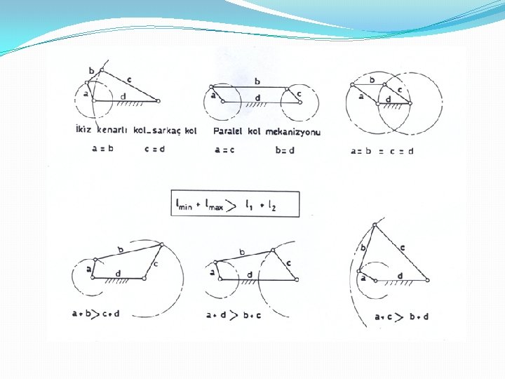 b) Eğer lmin+lmax=l 1+l 2 ise , Grasof kuralının sınır durununa sahip mekanizmalar elde edilir. Belirsiz mekanizmalar olarak adlandırılabilirler. Dallanma konumu denilen, 4 uzvun bir doğru üzerinde bulunduğu mekanizma konumu vardır. Sarkaç kolu bu konumunda olan hareket doğrultusunu değiştirebilir ya da korur. Bu koşulun özel hallerinde ; ikiz kollu, paralele kollu mekanizmalar elde edilir. sınır durumuna sahip mekanizmalar elde edilir. c) Eğer lmin+lmax>l 1+l 2 ise salınım yapan mekanizmalar elde edilir. 13