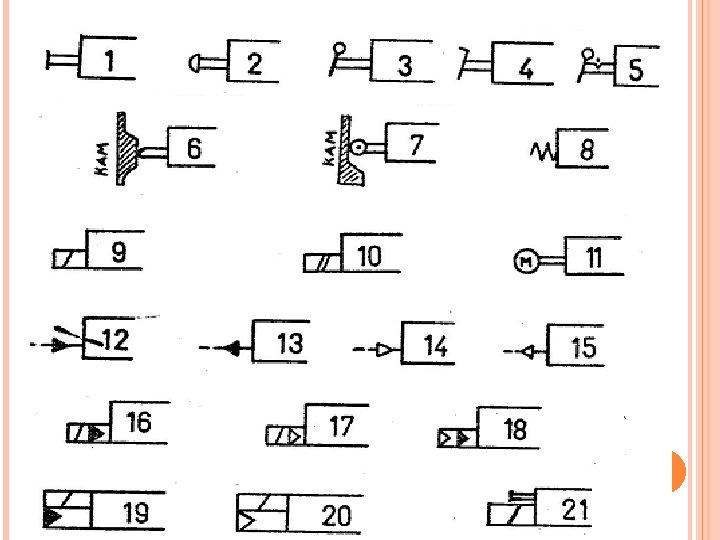 Yön Kontrol Valfi Kumanda Şekilleri: Aşağıdaki şekilde yön kontrol valflerinin kumanda şekilleri verilmiştir. Bu şekilde 1. genel, 2, butonla, 3. kolla, 4. pedalla, 5. kremayerli, 6. pimli, 7. makaralı, 8. yaylı, 9. tek sargılı bobinle (seleneoidelektromagnetik), 10. aynı yönde çift sargılı, 11. elektrik motoru ile, 12. hidrolik basınç uygulayarak, 13. hidrolik basıncı düşürerek, 14. basınçlı hava uygulayarak (pnömatik), 15. hava basıncını düşürerek, 16. elektro-hidrolik, 17. elektro-pnömatik, 18. pnömatik-hidrolik kontrol, 19. elektrikli ve hidrolik (iki alternatifli), 20. elektrikle ve pnömatik olarak, 21. elle ve elektrikle kontrolü göstermektedir.