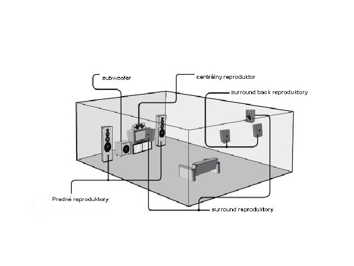 Reproduktory • Najsledovanejším parametrom je výkon, najvhodnejší materiál je drevo alebo MDF dosky • Umiestnenie reproduktorov: Ľavý a pravý predný reproduktor by mali stáť pri postranných stenách a vo výške hlavy. Peedný center v rovnakej výške ako ľavý a pravý, nie pred nimi. Ľavý a pravý zadný satelit umiestniť za miesto, kde budete sedieť. Subwoofer na miesto, kde budú najlepšie počuť basy.