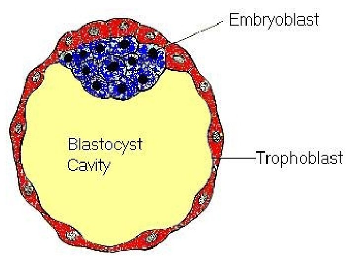 • The cells of the inner cell mass are attached to one side of trophoblast and project into the blastocyst cavity. • They are now referred to as embryoblast, which will form the embryo.