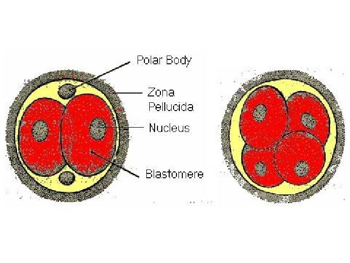 • The 1 st division of zygote gives rise to two daughter cells. They are called blastomeres. • Each blastomere is half the size of parent cell. They develop about 30 hours after fertilization. • Subsequent divisions follow one another, forming progressively smaller blastomeres.